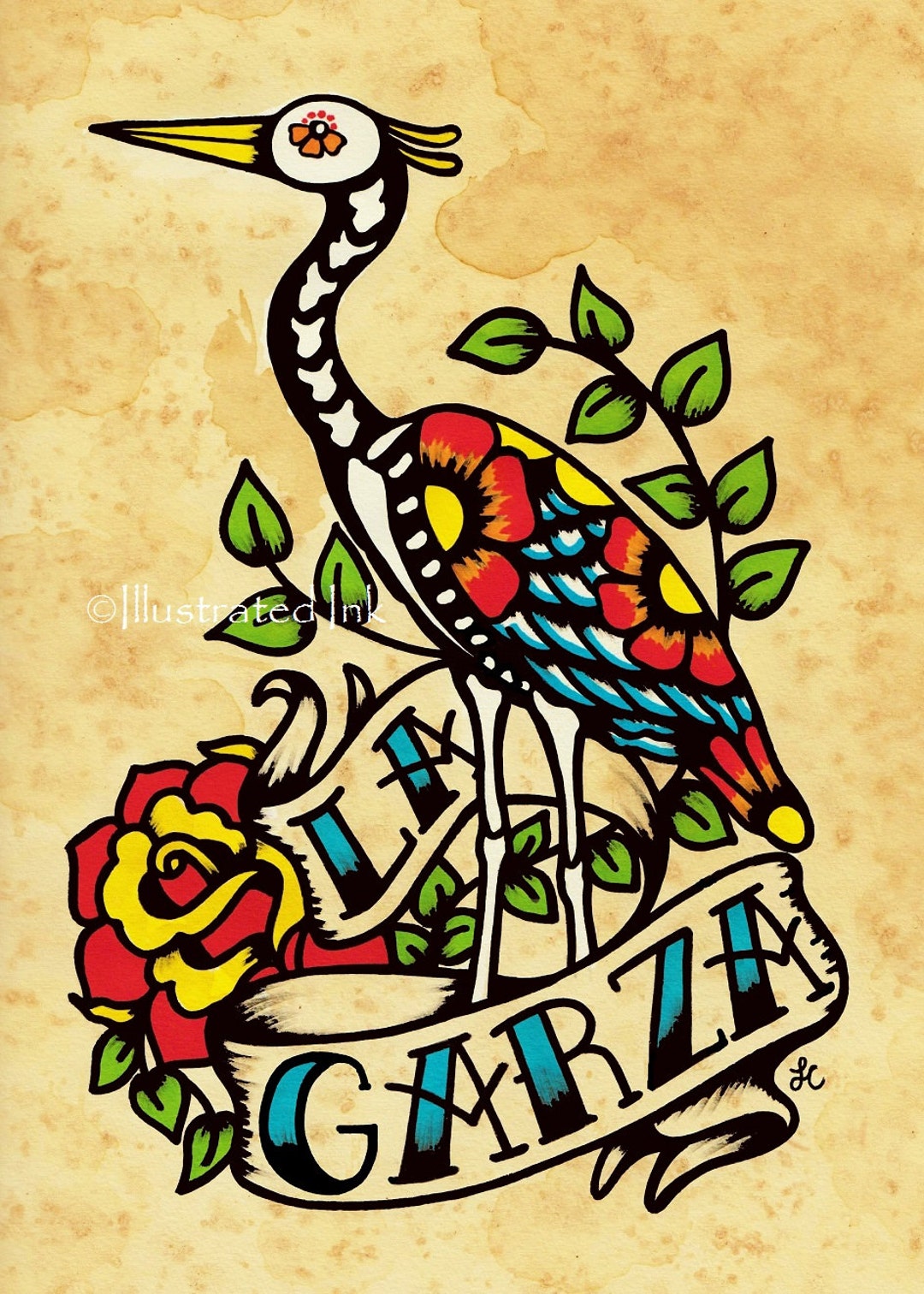 Day Of The Dead Tattoo Art La Garza Loteria Print 5 X 7 8 X Etsy